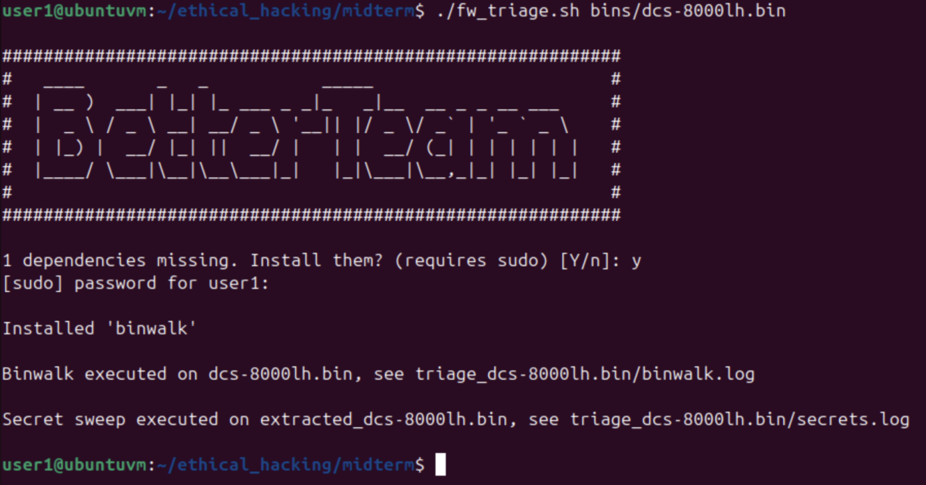 This was a group project for my Ethical Hacking course. My group of three was tasked with analyzing three embedded device firmwares and then creating a repeatable script to scan for our findings.